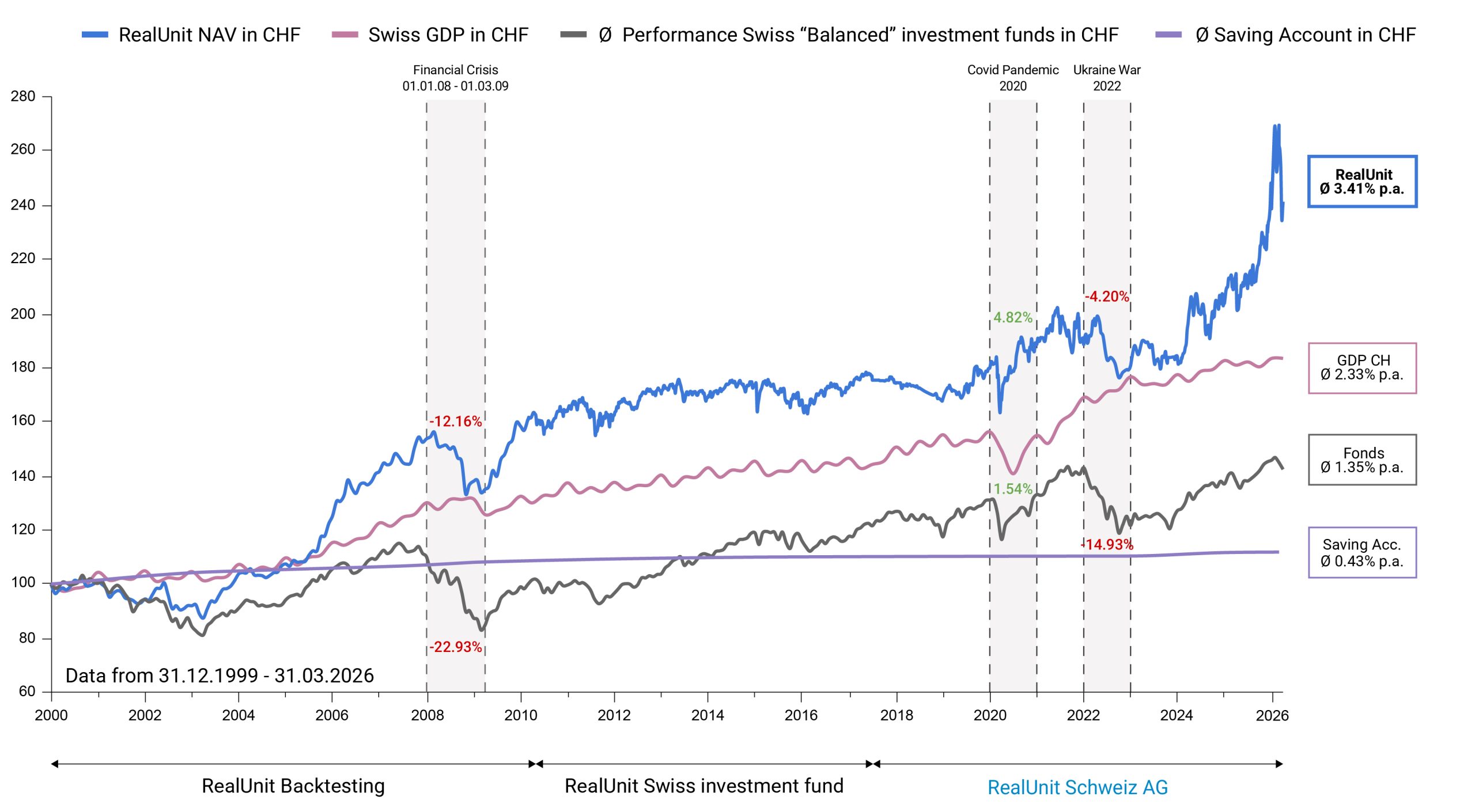 Sources: Bloomberg, SNB and RealUnit Schweiz AG, 31.12.2025 indicative information / The RealUnit investment strategy has been implemented in various forms since 2000. 2000-2009: RealUnit backtesting calculations, 2010-2017: Swiss investment fund, 2017-2025: RealUnit Schweiz AG. The average of the largest funds of Swiss banks with a ‹Balanced› strategy serves as a comparison. Past performance is not an indicator of future performance.