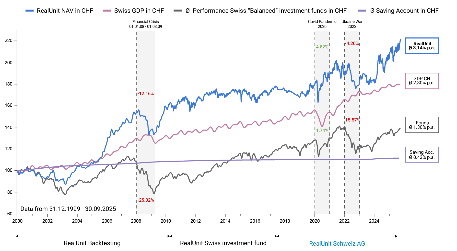 Sources: Bloomberg, SNB and RealUnit Schweiz AG, 30.09.2025 indicative information / The RealUnit investment strategy has been implemented in various forms since 2000. 2000-2009: RealUnit backtesting calculations, 2010-2017: Swiss investment fund, 2017-2025: RealUnit Schweiz AG. The average of the largest funds of Swiss banks with a ‹Balanced› strategy serves as a comparison. Past performance is not an indicator of future performance.